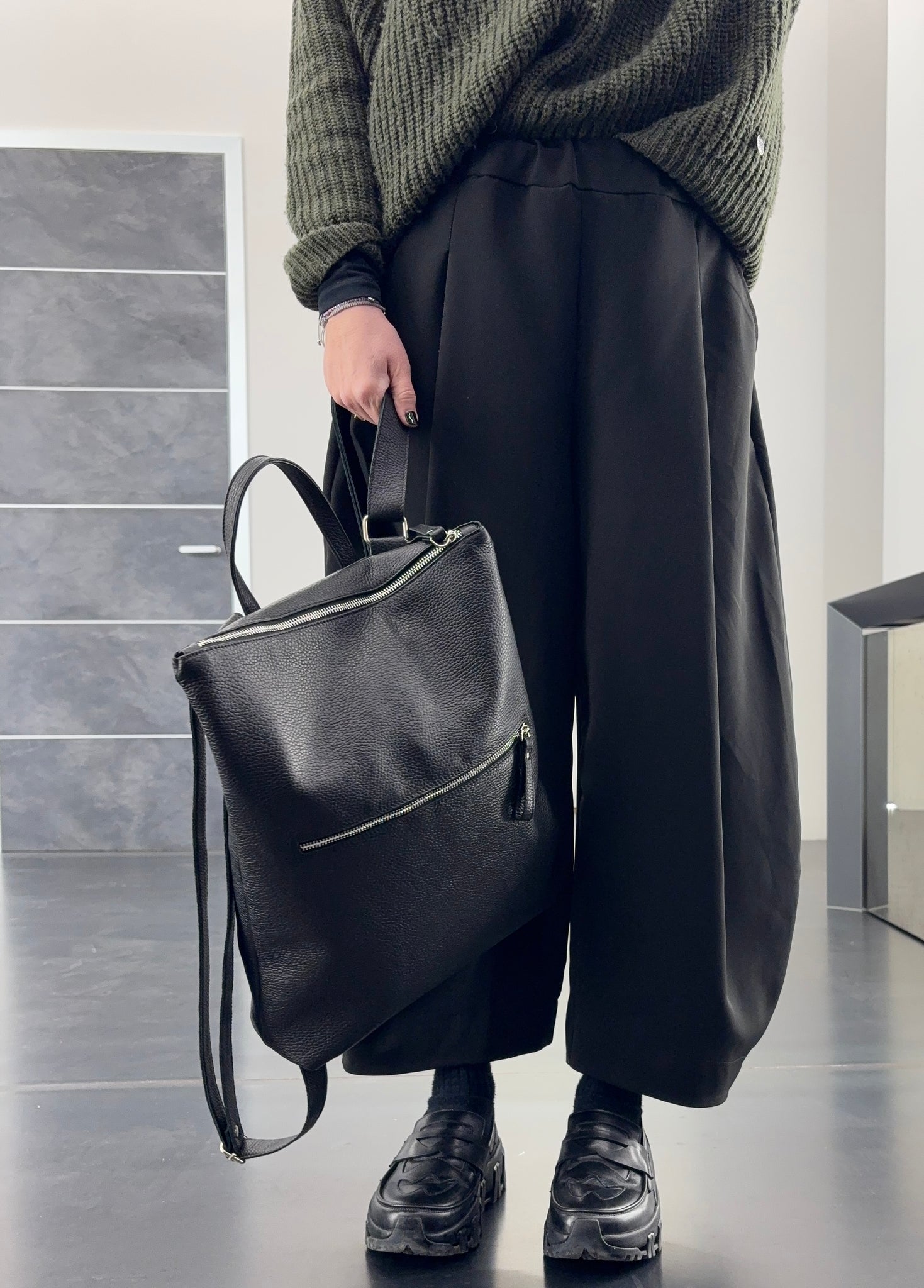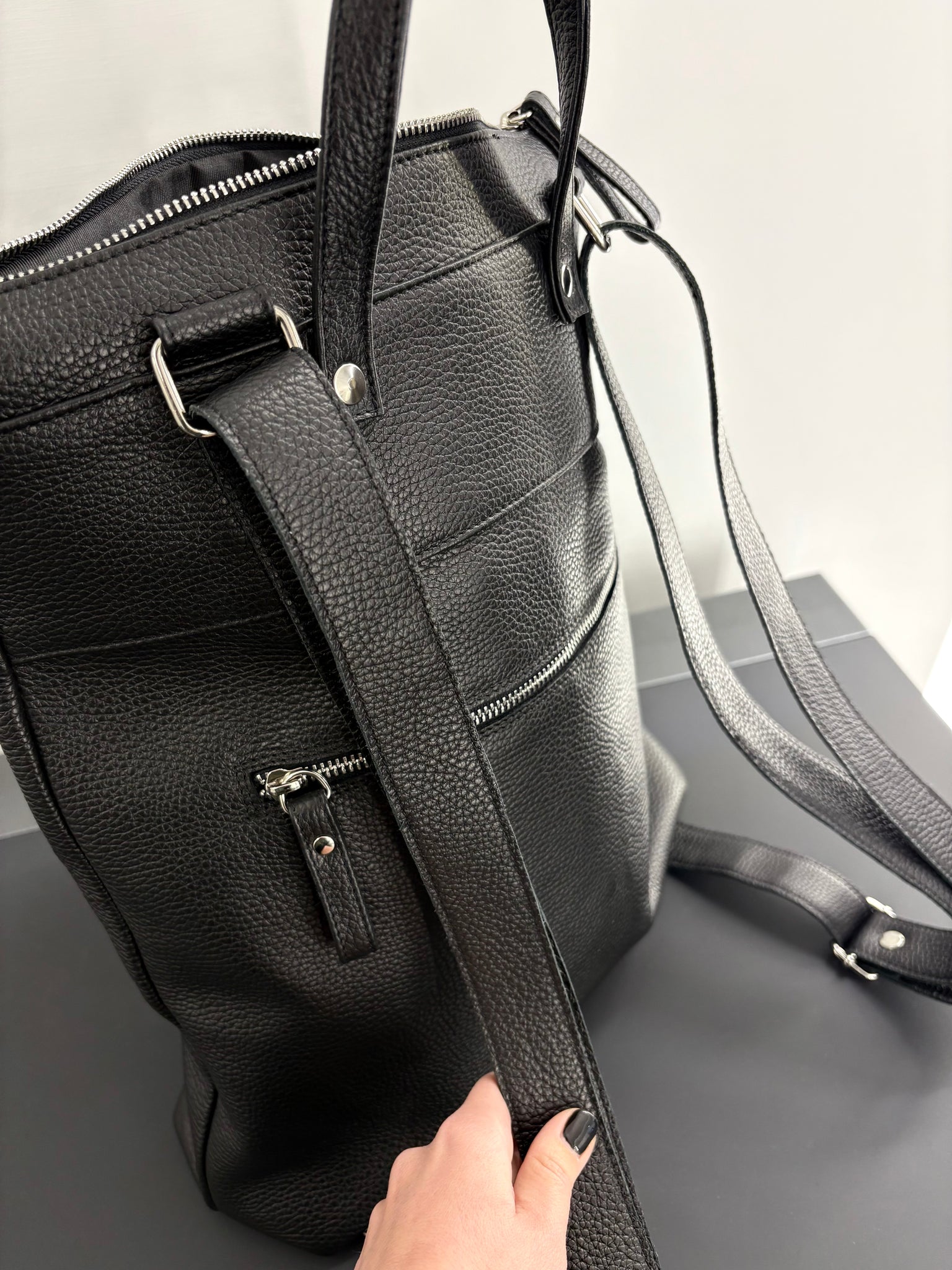 Backpak in pelle unisex misura 33 x 42 cm circa, con una tasca frontale e una tasca sul retro, fondo 10 cm.