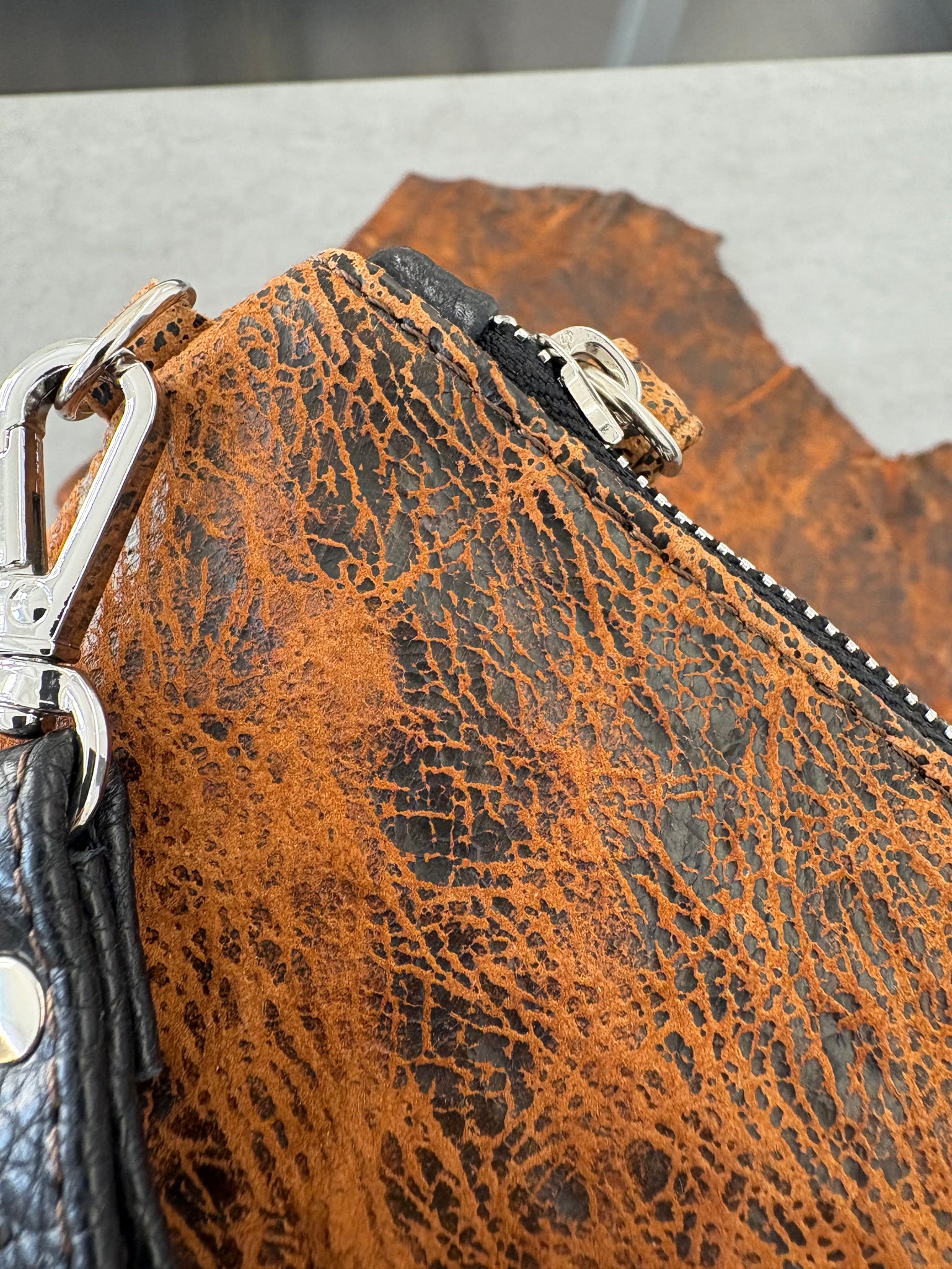 Pochette in pelle misura 21X15 cm con laccio da polso.